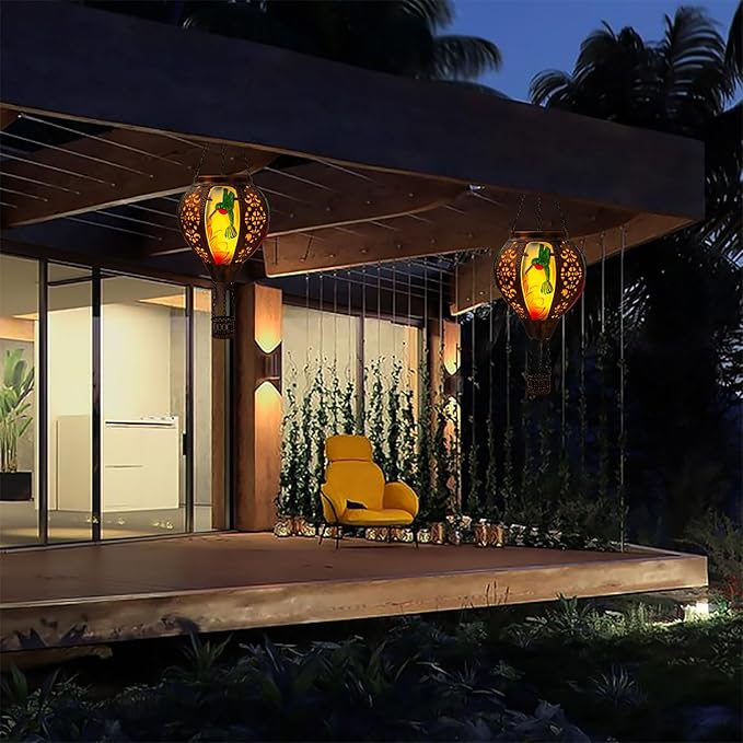 Hot Air Balloon Solar Lantern Hummingbird Lights, Flickering Flame Solar Hanging Lights for Outside,Waterproof for Garden Yard Patio Porch Decoration(Hummingbird)