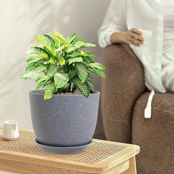 12/10/9 inch Large Plant Pots, 3 Pack Modern Decorative Plastic Planters with Drainage Holes and Saucer for House Garden Plants, Flower Pots for Indoor Outdoor Plants, Speckled Grey