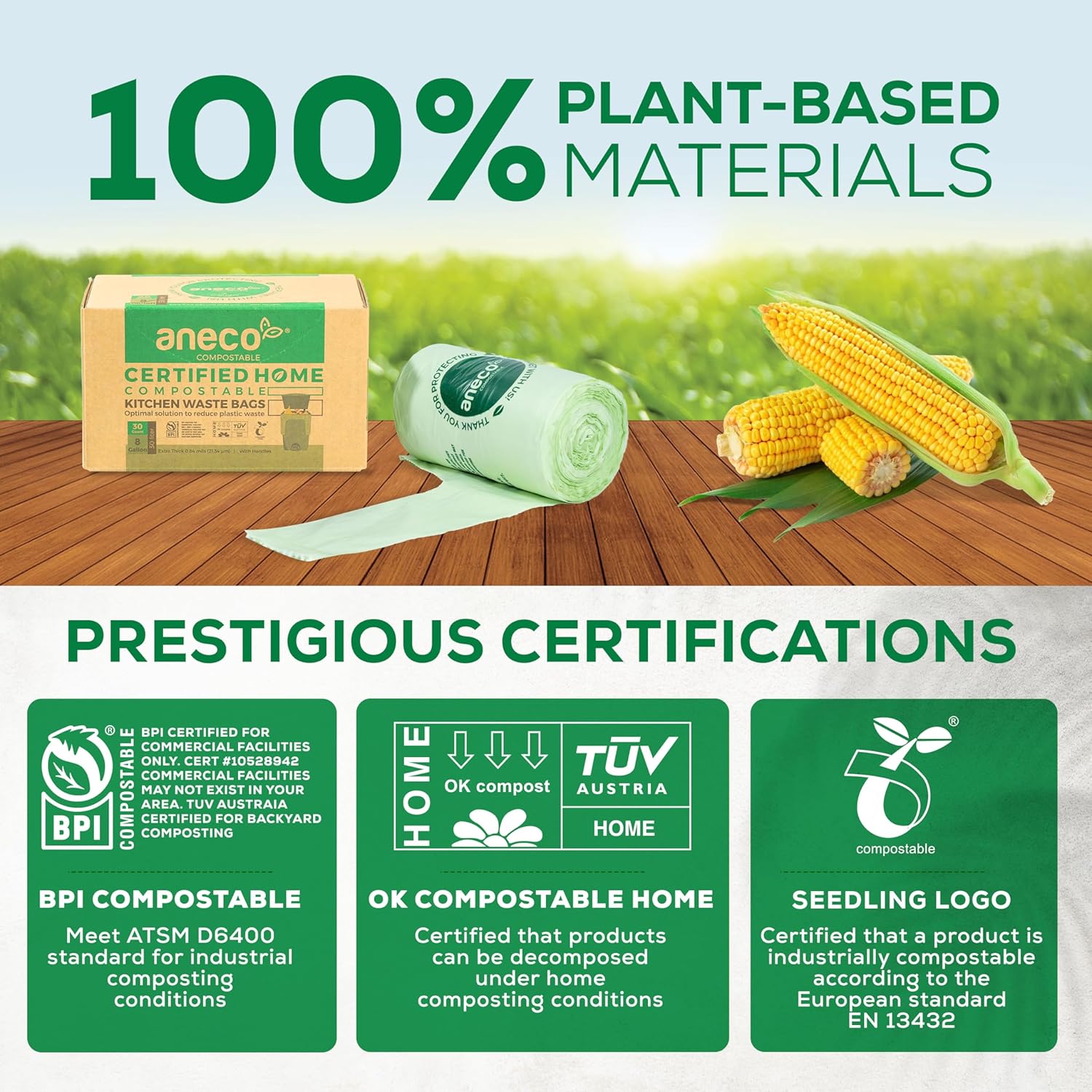 - 🍀 𝐒𝐮𝐬𝐭𝐚𝐢𝐧𝐚𝐛𝐥𝐞 & 𝐍𝐚𝐭𝐮𝐫𝐚𝐥𝐥𝐲: Made from renewable resources like corn starch and plant-based materials, ANECO 8 gallon garbage bags decompose naturally into CO2, water, and biomass within a year, leaving no harmful traces. Prestigious certifications from BPI Compostable (US standard ASTM D6400), TUV Austria (OK Compost Home), and European Bioplastics (Seedling Logo) guarantee their eco-friendliness.