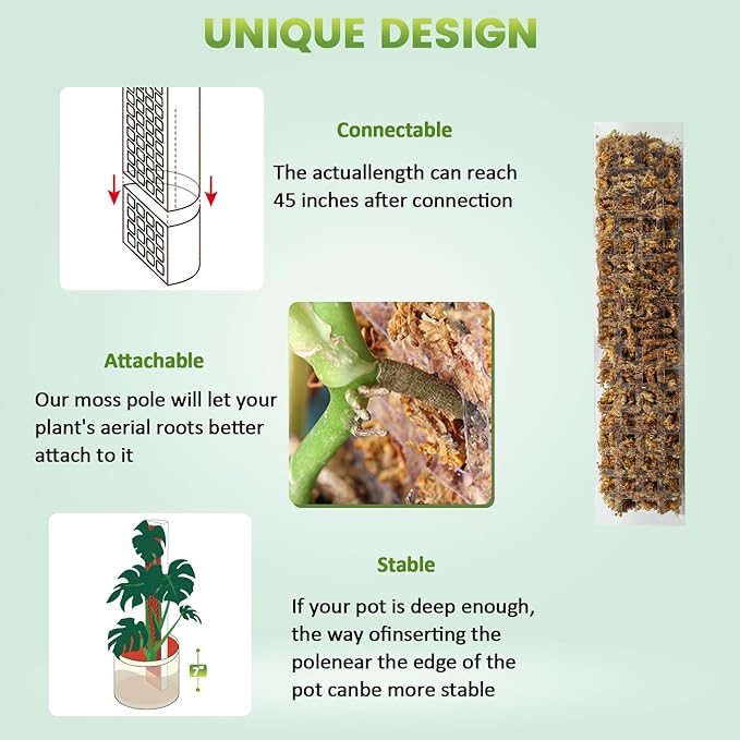 - [Train Your Plants to Grow upwards] The sphagnum moss pole greatly helps climbing indoor potted plants with aerial roots overcome the difficulty of growing vertically towards sunlight and develop more, larger and greener leaves.