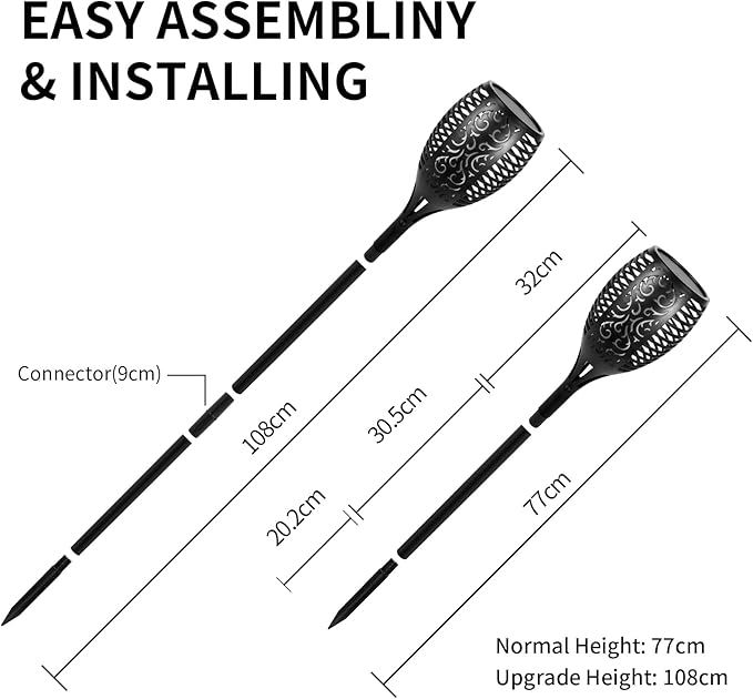- We use a taller and larger design than most other vendors. The tool-less modular system allows the height to extend from 14”-25”-37”-43” depending on your choice. No wiring necessary! They can be staked directly into the ground, or screwed into any solid horizontal or vertical surface. You can have them working and installed literally within 5-10 minutes of unboxing!