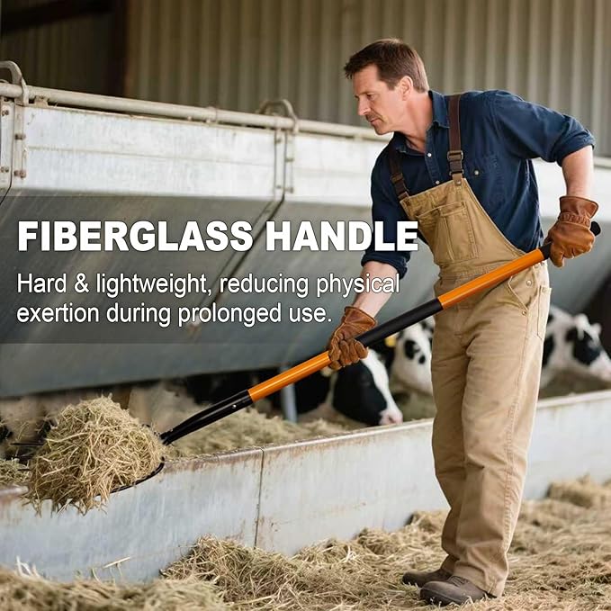 - High Quality Material: The handle of the heavy duty pitchfork made of thickened fiberglass material, which is lightweight, sturdy and not easy to break. The garden fork head is made of high quality carbon steel, which is sturdy and not easy to deform. The surface of the pitch fork for compost head is coated with rust-resistant coating, so it is not easy to rust even when it is used in a humid environment.