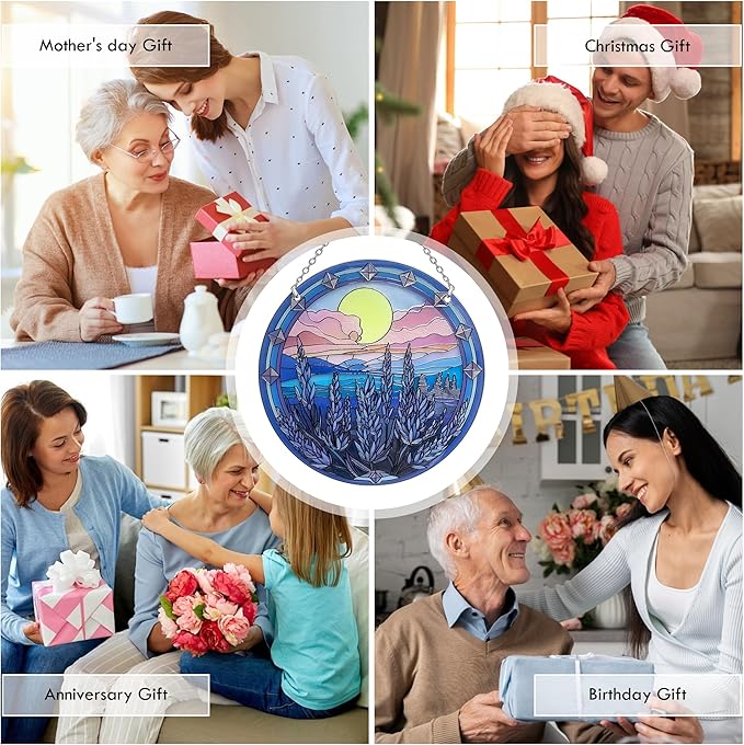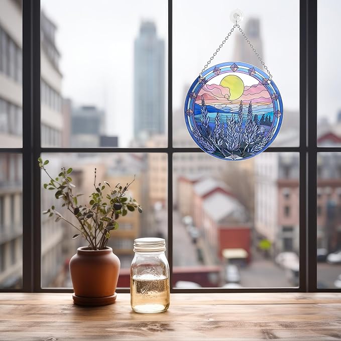 6’’ Lavender Suncatcher Stained Glass - Sun Catcher with Mountain Stained Glass Window Hanging, Suncatchers for Windows Hanging, Lavender Wall Decor, Suncatcher Gifts for Women/Friends/Lover