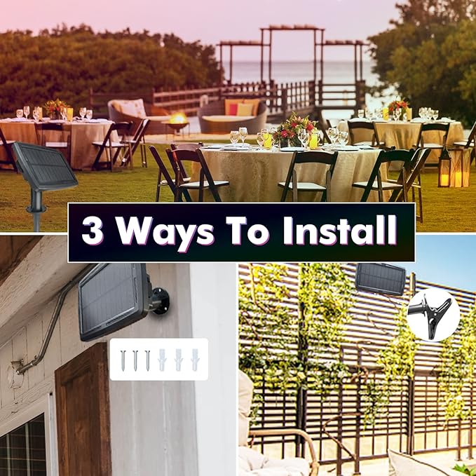 - No Power Outlets Needed – Flexible & Easy Installation: Enjoy solar-powered string lights outdoor waterproof with no socket restrictions. Simply stake or clip the solar panel anywhere with direct sunlight, making these LED patio lights ideal for balconies, decks, yards, and camping setups.