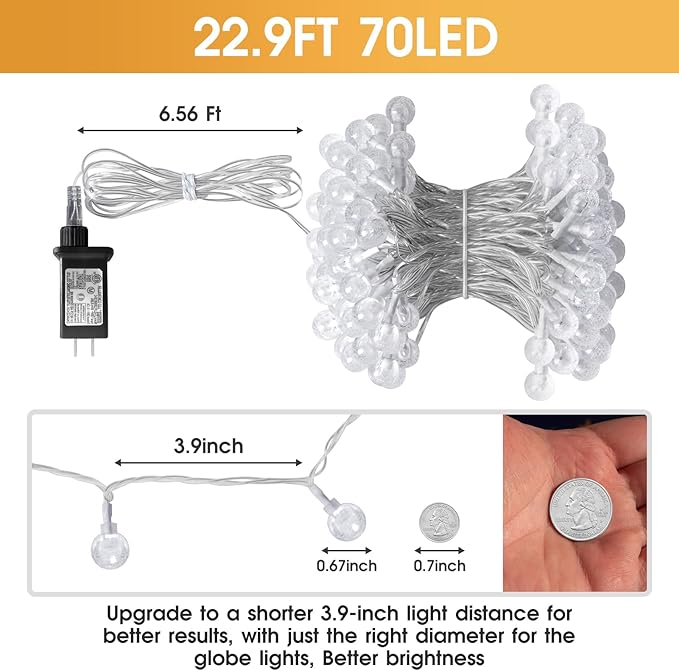 - Commercial quality string lights: The globe around the lights are shatterproof because they are made out of plastic. 70 led bulbs give off a warm white light. An ul listed power adapter comes with the lights,and the spacinga between bulbs is 3.94 inches
