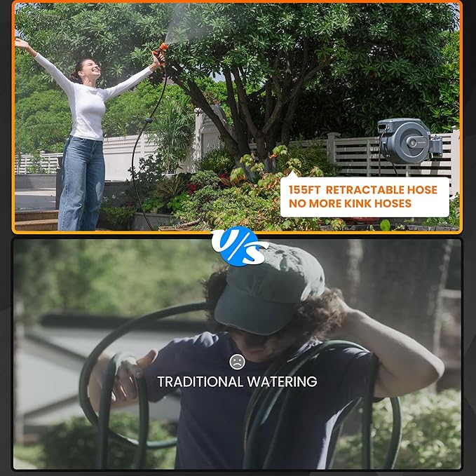 - High Grid Garden Hose: The hose reel is made to be long-lasting and leak-proof with all-weather flexible and abrasion-resistant hybrid hose. Both the 200 PSI pressure test and the 600 PSI bursting pressure test were successfully completed by the 155-foot, 1/2-inch retractable hose.