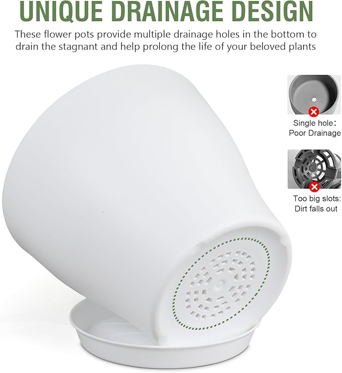 - 【Drainage Holes and Trays】Each plant pot features well-designed drainage holes at the bottom to ensure proper water flow. Additionally, saucers catch excess water, keeping your growing area clean and tidy while also ensuring that your plants remain hydrated without becoming waterlogged.