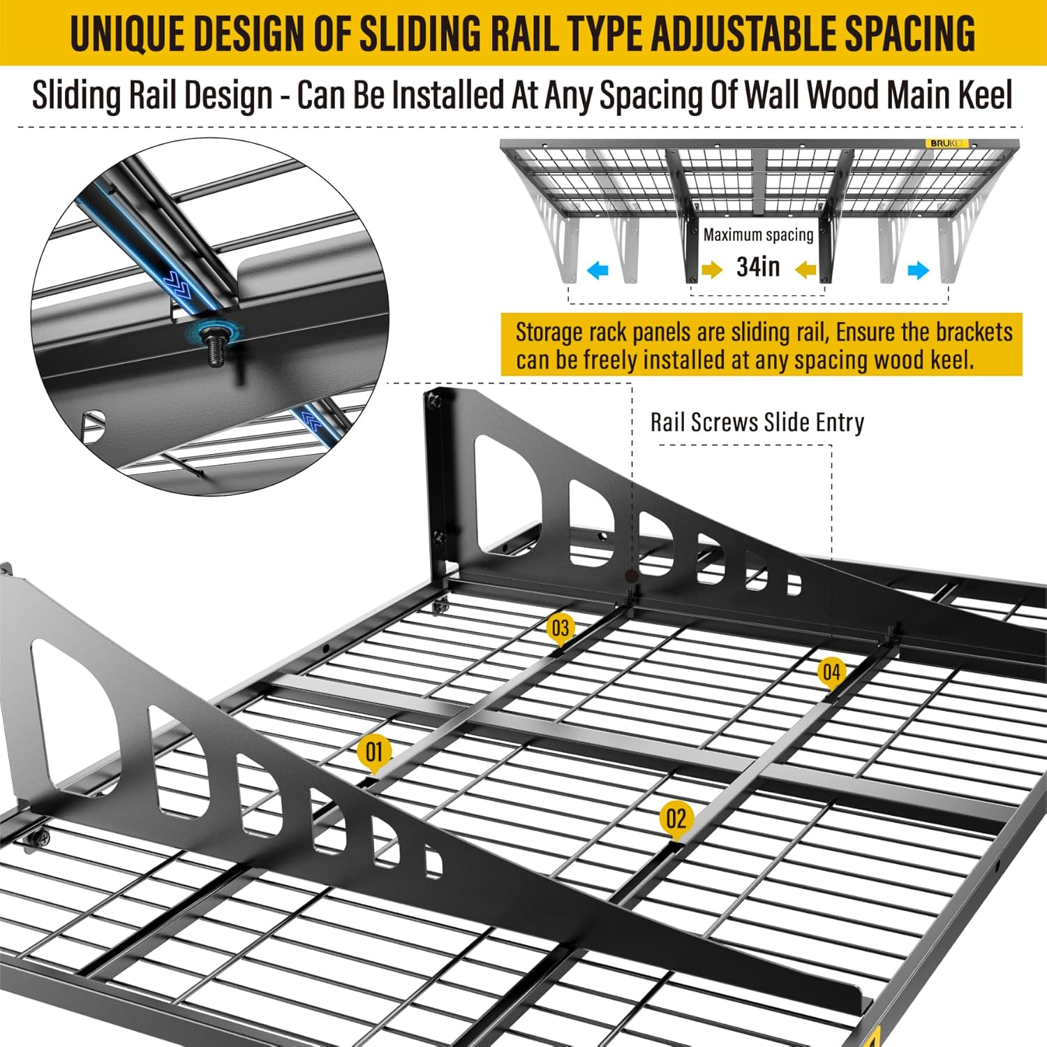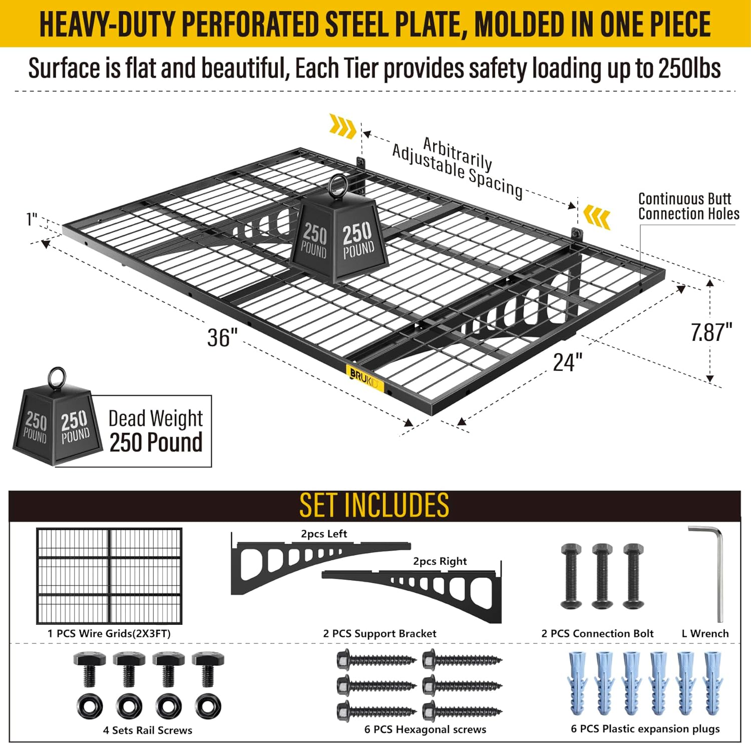 - KIT INCLUDES:Includes 1pc-Grid Shelf; 2pc-Brackets; 6pc-Hexagonal screws (Hardened ∅0.2" L/2"); 4Sets-Rail attachment bolts; 1pc- Drill bit; 1pc-Socket; 1pc-installation manual. All hardware of Brukid Professional Series Wall Mounted Shelf are under strict quality control and testing, We strive to provide our customers with a quality shopping experience, If you have any questions, Please feel free to contact us