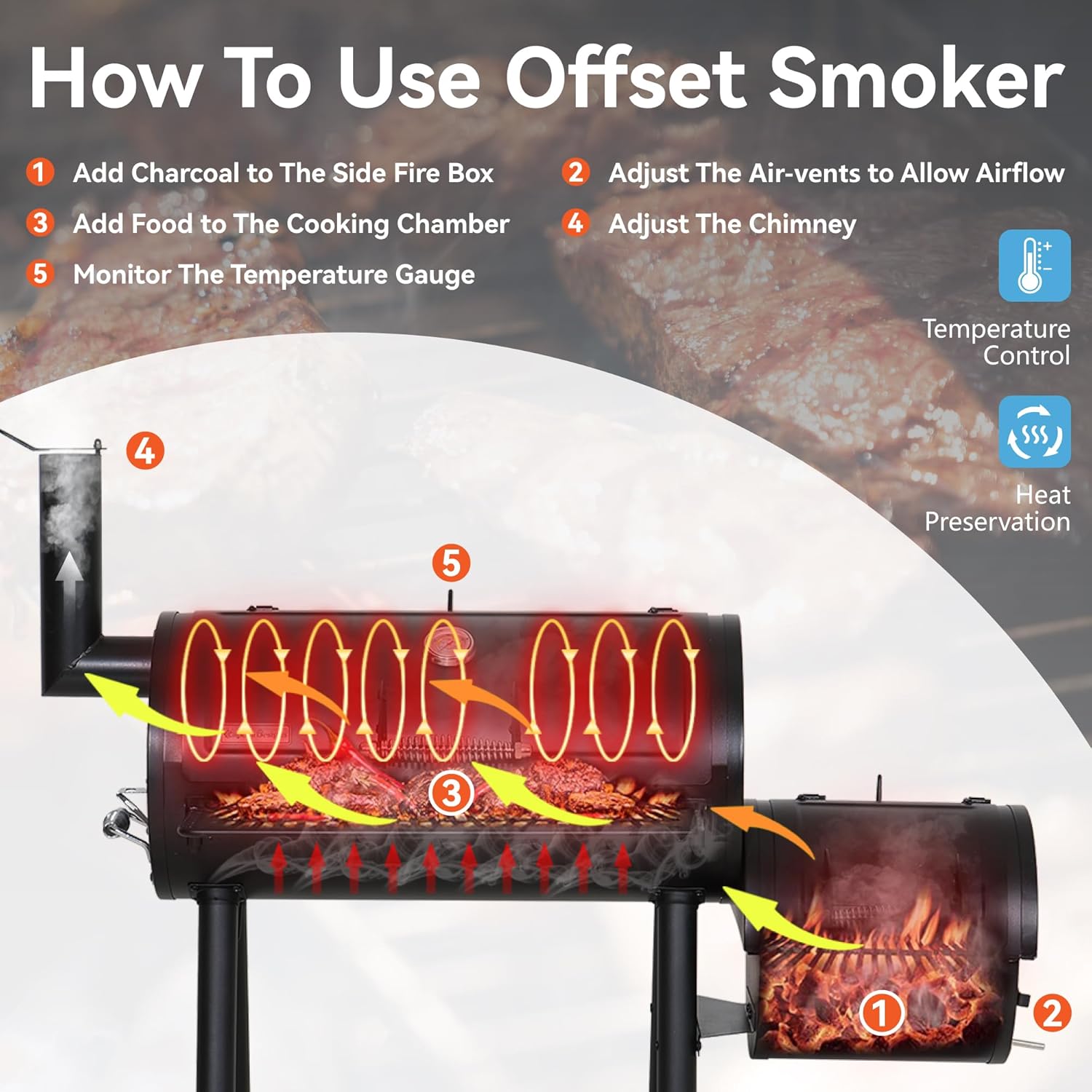 - 2 IN 1 SMOKER & CHARCOAL GRILL COMBO: Designed for use as either a traditional offset smoker or a charcoal grill. We provide charcoal grates for the main chamber and grilling grates for the side firebox. This allows the large smoker to be easily converted into a large charcoal grill