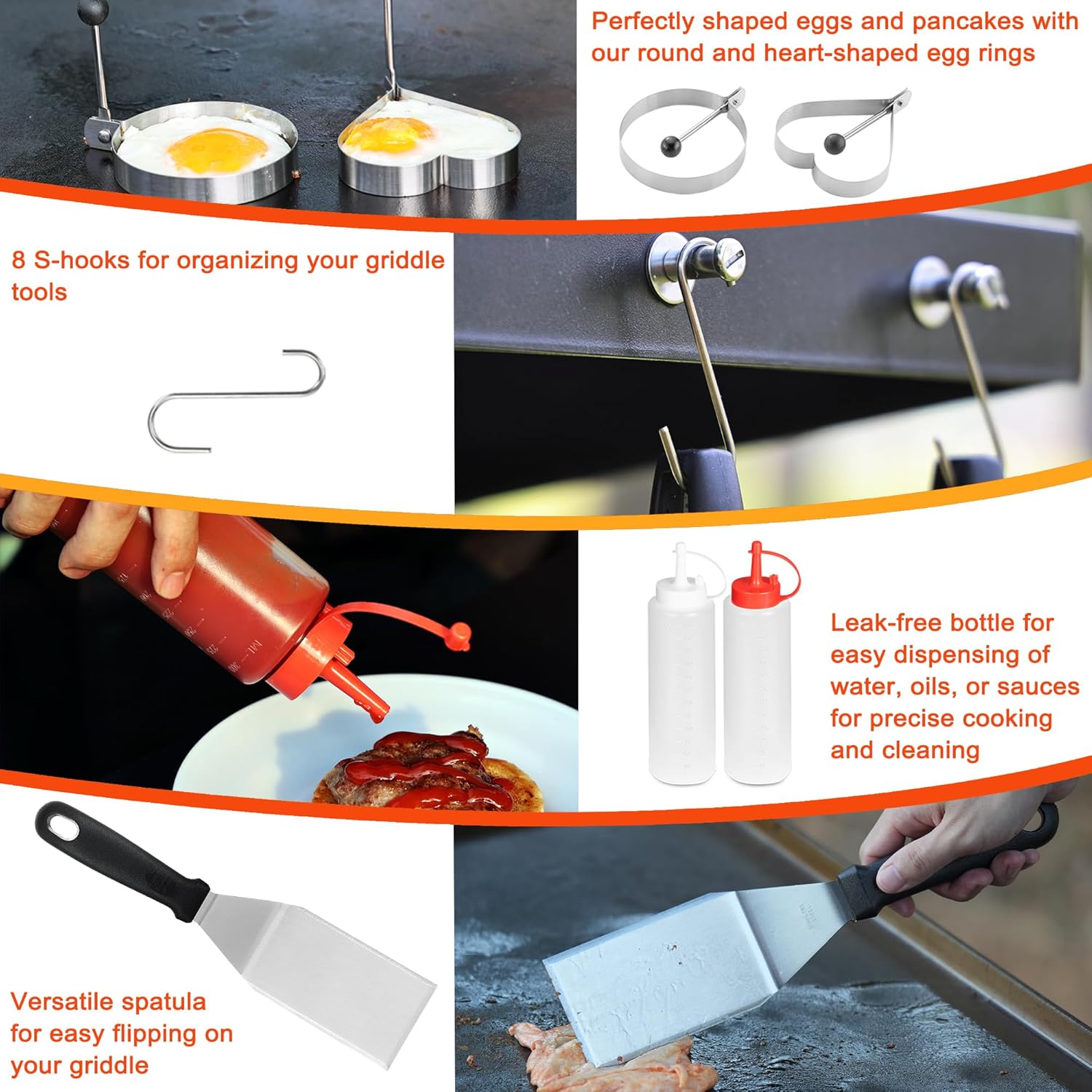 - Complete Griddle Accessories Set: 40-piece kit featuring essential griddle tools including two basting covers, oversized spatulas, burger turner, burger press, grill tongs, silicone sauce brush, scrapers, squeeze bottles, scissors, etc
