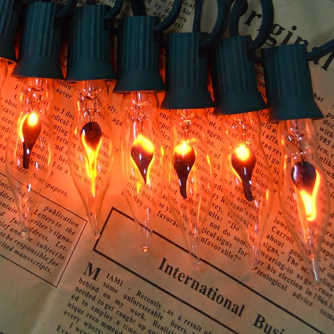 - 🔥【Clear Flame Lights Specifications】: This unique fake flame Christmas lights string is 12.8 feet in total length with 39.5 inches / 1 meter male plug leads, 12 inches spacing between bulbs, and 6 inches female plug leads. Each string of flame lights has a total of 10 clear glass flame bulbs and 2 spare C18 clear flame bulbs, 1 watt, 120 volts. Flashing Christmas lights provide 2000+ hours of illumination and are safe and durable, eliminating the need for frequent bulb changes.