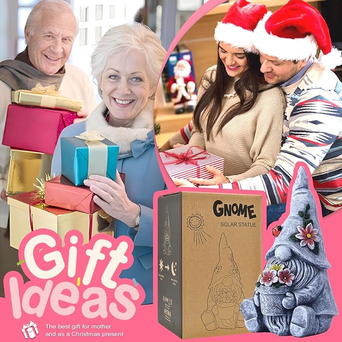 Goodeco Sitting Gnome Holding Flower Statue - Solar Garden Gnomes Decor for Outside with LED Lights, for Women or Moms, Housewarming Gnome Decorations