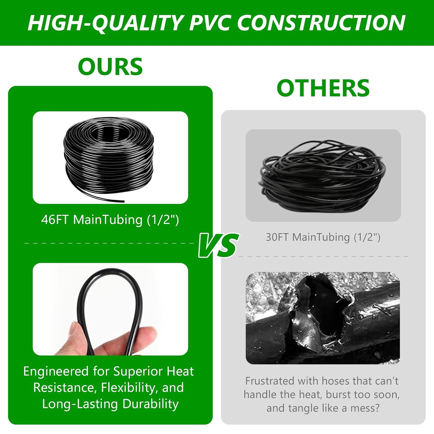 - Efficient Water Distribution Setup: Establish a 3/4 connection from your water source to the watering area.Utilize the 1/2-inch irrigation tubing as the mainline, branching off with the 1/4-inch drip irrigation tubing.Connect up to 52 drip irrigation emitters for comprehensive coverage