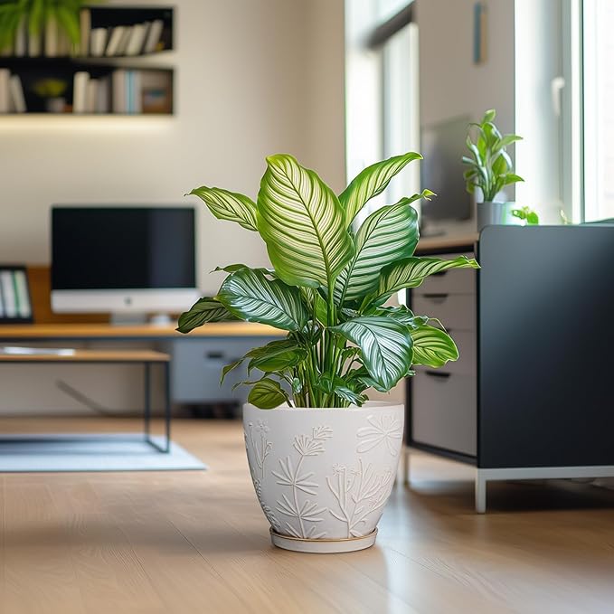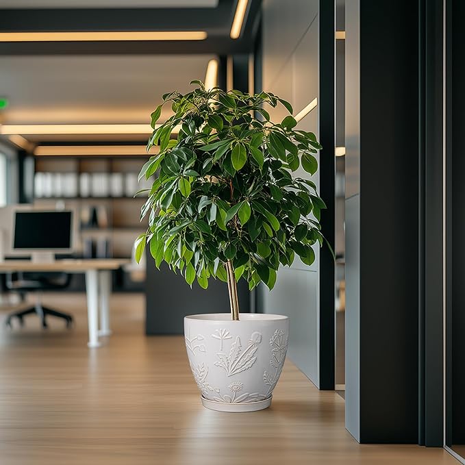 • Stylish Appearance: Our ceramic planter pot has a white main colour, a beautiful embossed flowers and plants pattern on the surface, elegant appearance making it ideal for home decor, garden decor and office decor