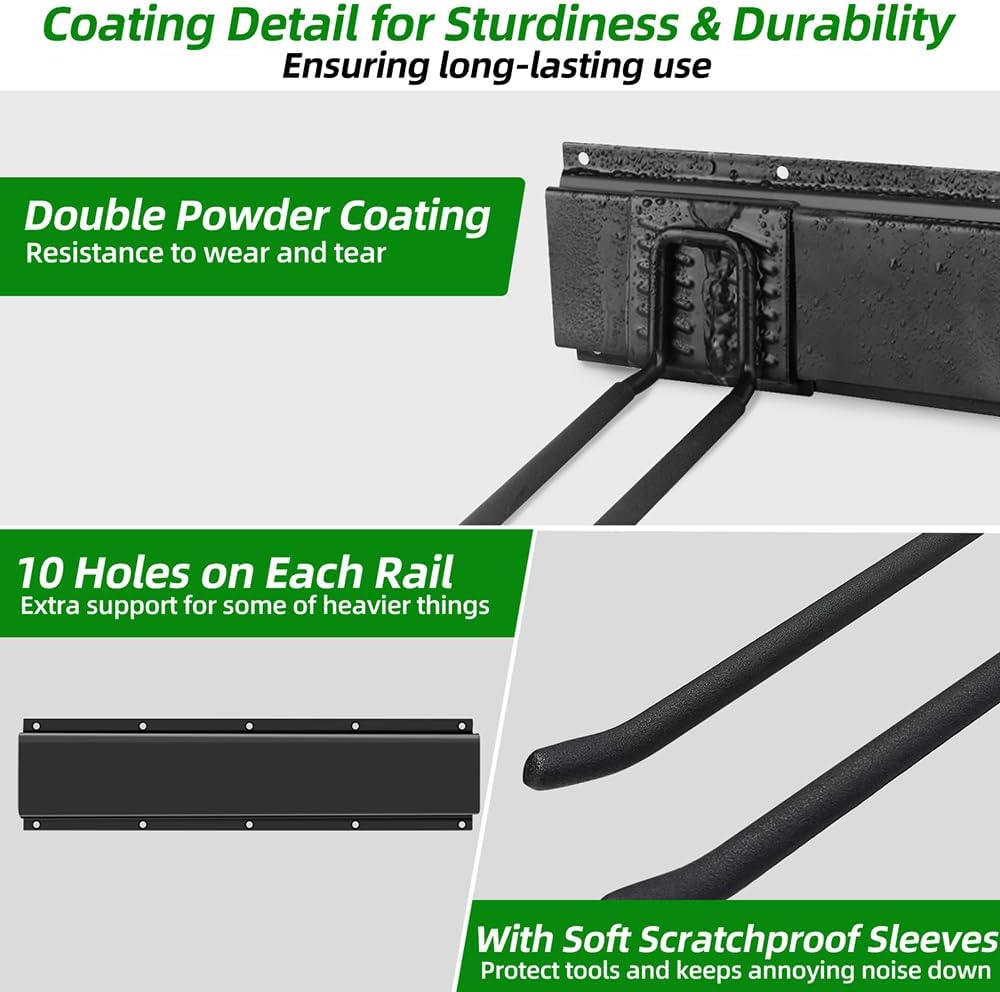 - Space-Saving Design: The hooks have a nice soft coating that will protect tools keeps any rattle or annoying noise down with you place thing on or take things off the rack. Tool rack Utilizes unused wall space, helping keep garage tidy and clutter-free