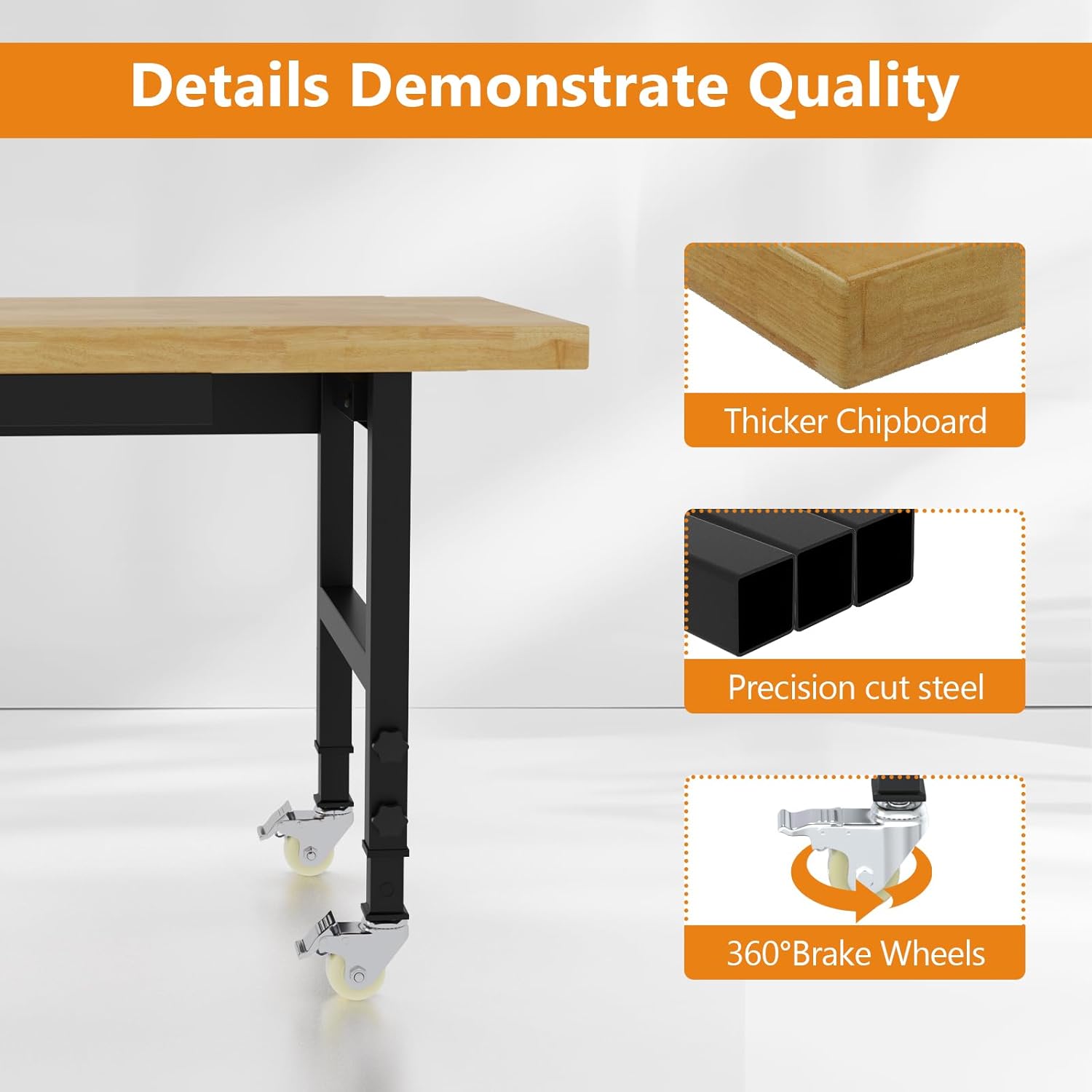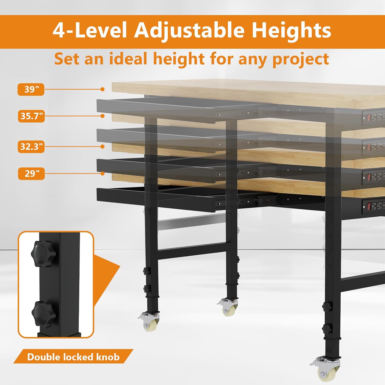 60" Work Bench with Wheels, Adjustable Height Workbench with Drawers, Heavy-Duty Work Table with Power Outlets, 2000 LBS Capacity Workstation for Garage, Workshop, Office, Home