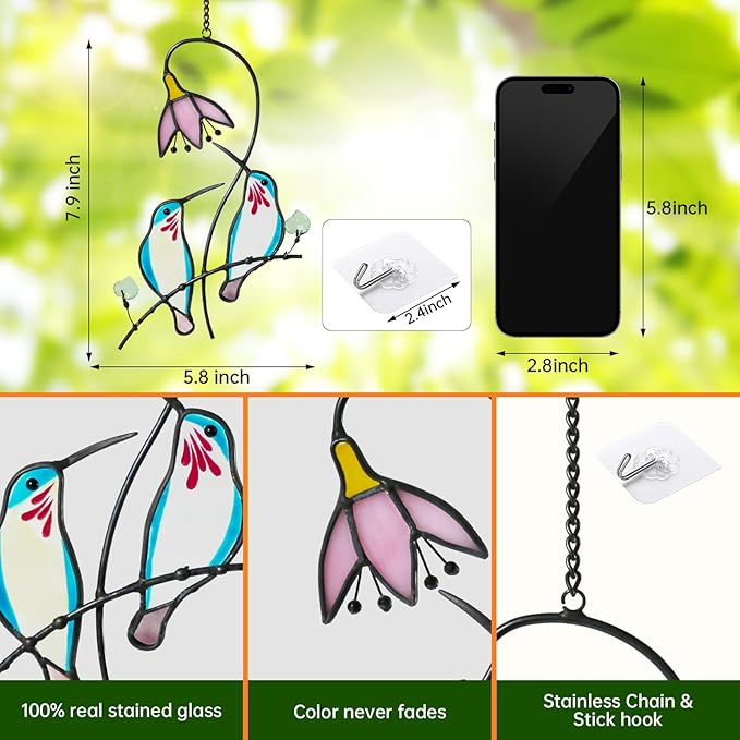 2 Hummingbirds Stained Glass Suncatcher for Windows Hangings Ornament, Hummingbird Sun Catchers Gifts for Women,Indoor Window Decor, Memorial Gifts for Mom/Bird Lovers