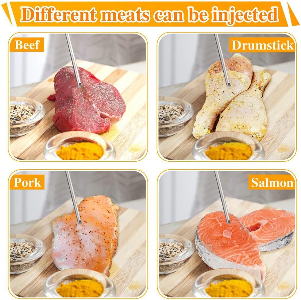 - Perfectly Flavored Meat: Enhance the taste and juiciness of your meals with this versatile injector. Ideal for marinating Thanksgiving turkey, Christmas beef brisket, pork, lamb, chicken, goose, or duck. Also great for injecting flavor into desserts like jelly-filled donuts or rum-soaked strawberries, and for brining home-cured meats. A must-have for holiday feasts, BBQs, family parties, and bonfire gatherings.