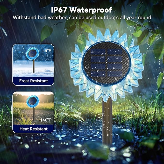 - All-Weather Durability: Made of high-strength ABS materials, IP67 Waterproof, heat-resistant, frostproof, dustproof, it can withstand all kinds of weather as outdoor decorations for patio, you can enjoy the beautiful solar garden lights outdoor waterproof all year round