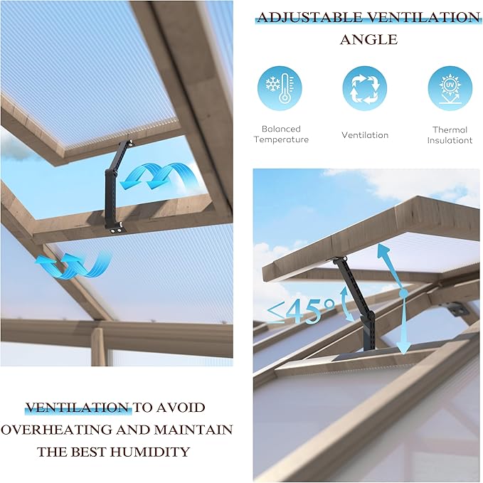 - Adjustable Roof: Our wooden outdoor greenhouse is designed with adjustable roof which is fixed with the joint to adjust the opening angle. You can adjust the angle to meet your needs, and the maximum opening angle is 45 degree. Adjustable roof design provides UV protection while ensuring temperature balance and air circulation