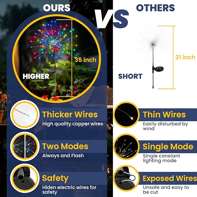 - 【Upgraded Solar Garden Lights】Each pack contains 2 lights, each with 120 LEDs, working with two modes between flashing and steady lighting, easily operated by a button. Suitable for outdoor garden and courtyard decoration, adding beauty and a unique atmosphere to home. Decorate your playhouse, balcony, patio, planters as you like. It is an ideal choice with high quality and durability