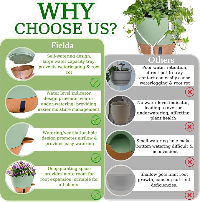 - 【Water Level Indicator Design】Unlike other hanging planters, Fielda hanging plant pot features an innovative design with a specially crafted visible window in the bottom tray, allowing you to monitor the water level at any time. This way, you can prevent plant damage from underwatering or overwatering with ease.