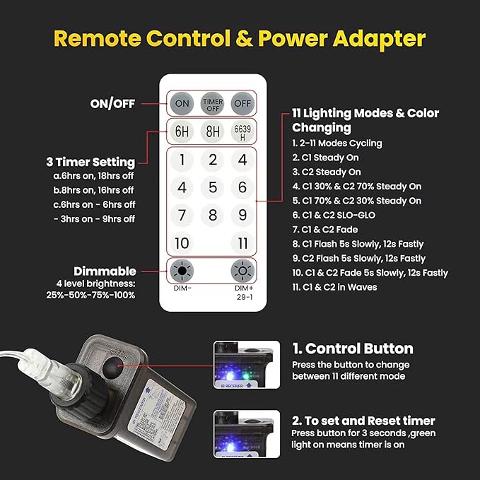- 4 in 1 Color Changing String Lights: Plug in String Lights can switch freely between Warm White and Multicolor, 200 LED 115ft(98.6ft String Lights,16.4ft Lead Wire), You would like the multiple display options and being able to have either all warm white, all color, or both together.