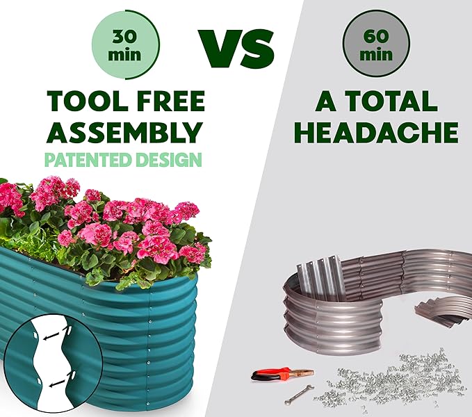 - EFFORTLESS ASSEMBLY, LIKE NO OTHER! Begin your planting journey by choosing our innovative patented design, featuring the perfect combination of easy assembly and durability. Thanks to our unique tool-free design, assembly is a breeze and can be completed in just 30 minutes! Get started on your garden right away and enjoy fresh, healthy produce in no time.