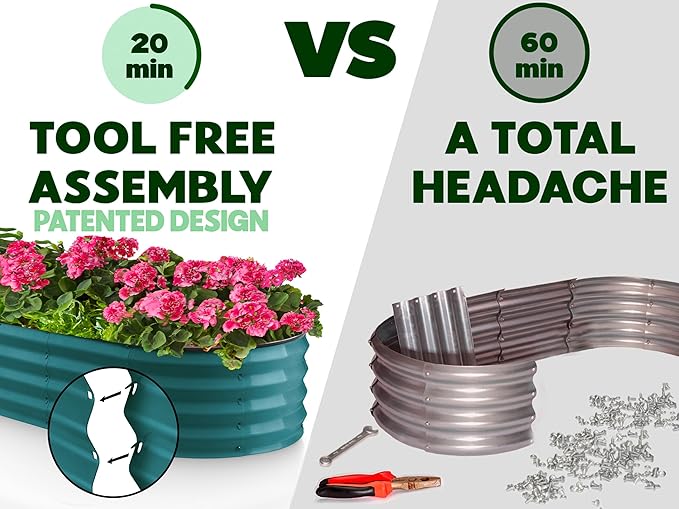 - EFFORTLESS ASSEMBLY, LIKE NO OTHER! Begin your planting journey by choosing our innovative patented design, featuring the perfect combination of easy assembly and durability. Thanks to our unique tool-free design, assembly is a breeze and can be completed in just 30 minutes! Get started on your garden right away and enjoy fresh, healthy produce in no time.