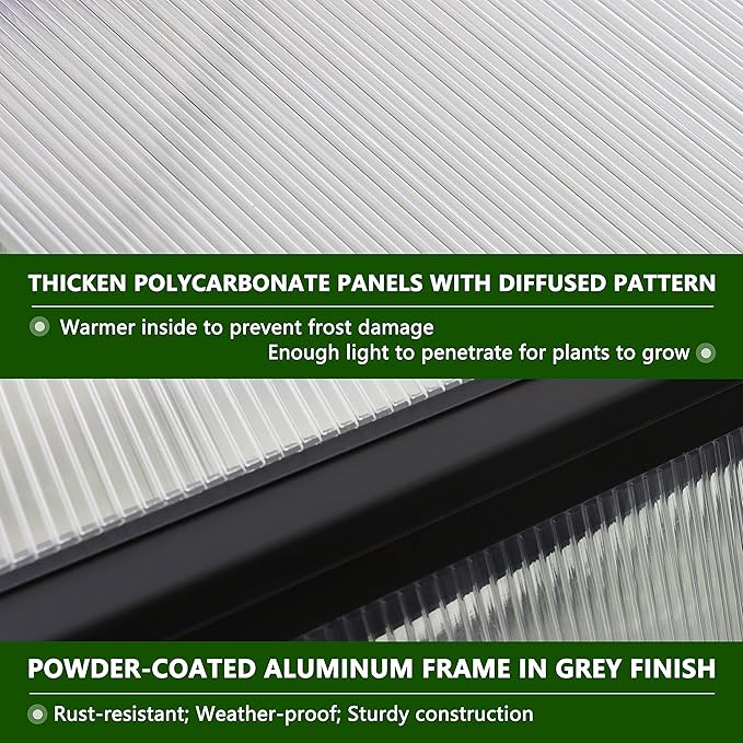 - Heavy Duty Greenhouse for Ootdoor: The frame of our greenhouse is made of high quality, corrosion and weather resistant gray powder coated thickened aluminum that is rust resistant and stable in all climates. Thick polycarbonate panels with a diffusion pattern provide extra warmth for the plants and prevent frost, making the plants absorb more sunlight and thrive