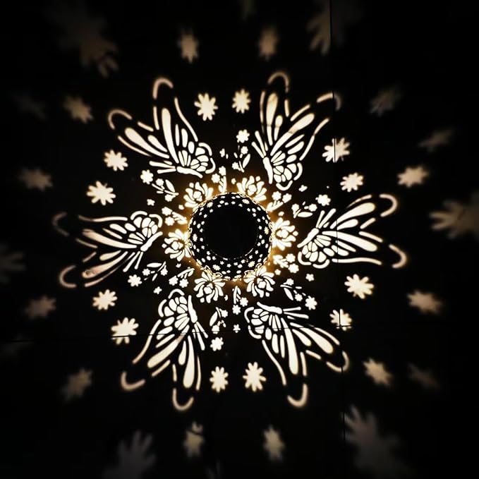 - The lantern casts a mesmerizing shadow pattern resembling an enchanting floral mandala intertwined with graceful butterfly silhouettes. Delicate blossoms and intricate wings radiate outward in perfect symmetry, creating a celestial dance of light and shadow. This luminous display transforms any space into a serene and magical ambiance, evoking a sense of wonder and artistry.