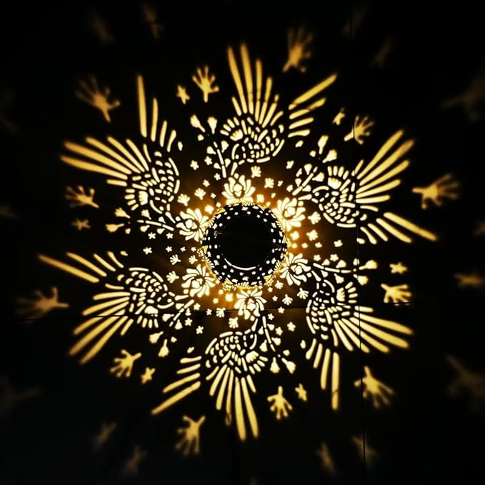 • The lantern projects a breathtaking shadow display, radiating an intricate symphony of light and artistry. The pattern showcases elegant hummingbirds with outstretched wings, encircling a luminous center like guardians of a celestial garden. Blossoming flowers and delicate starbursts weave into the design, creating a harmonious blend of nature and fantasy. The interplay of light and shadow evokes a serene and ethereal atmosphere, turning any space into a poetic haven of tranquility.