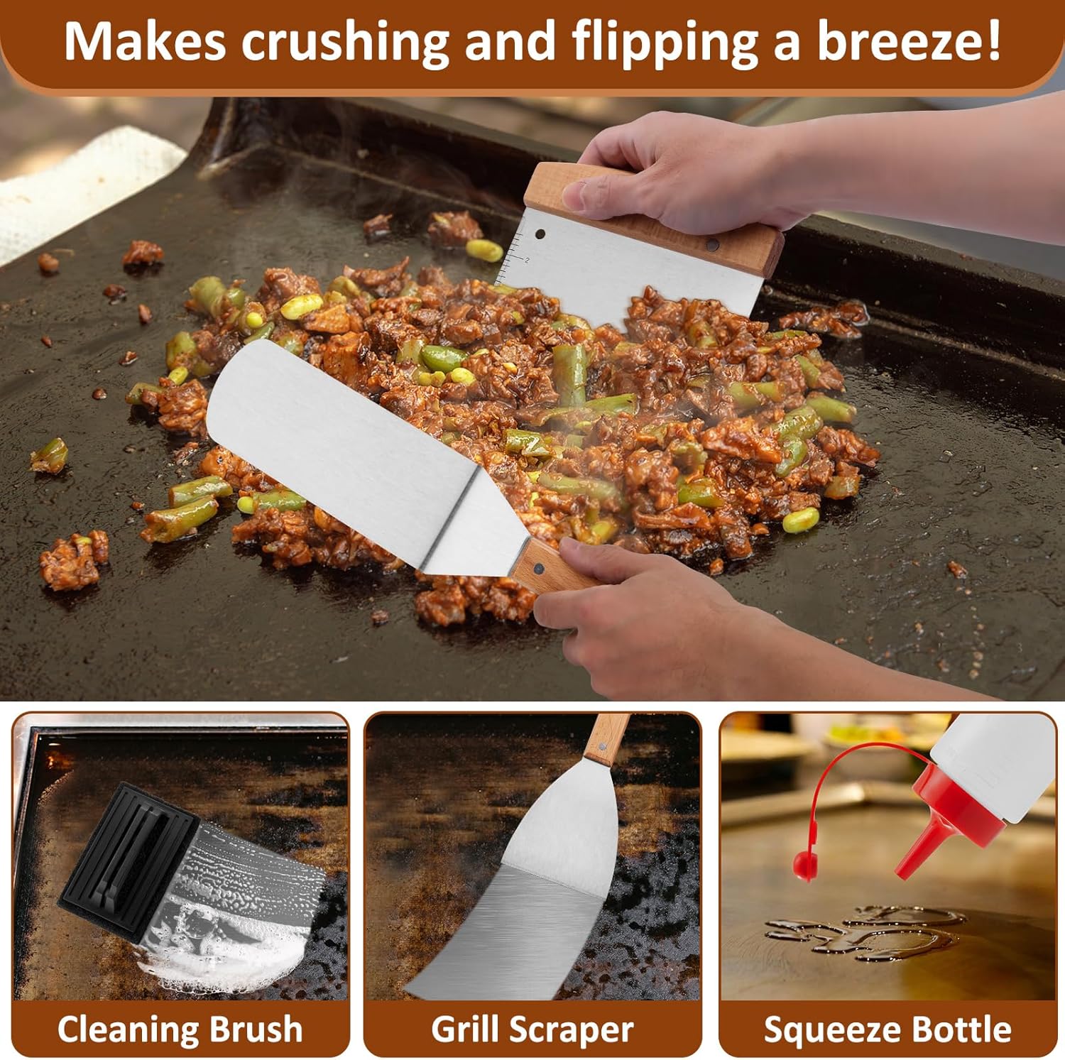 - PREFERRED CHOICE & IDEAL GIFT, flat top grill accessories for novice to expert grillers, making it easy for you to navigate all kinds of cooking challenges to enjoy grilling and cooking to the fullest. Beautifully wrapped package is an ideal gift for friends, lovers, family, and like-minded barbecue enthusiasts, suitable for any flat top grill, iron plate or cast iron grill