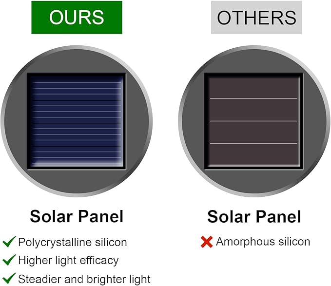 - Better Solar Panel: Unlike other outside solar hanging light panels made of Amorphous silicon, Our solar lights are made of Polycrystalline silicon which has higher light efficacy. With the same charging hours, our solar panels can save more electricity in the daytime and casts brighter and steadier glow at night.