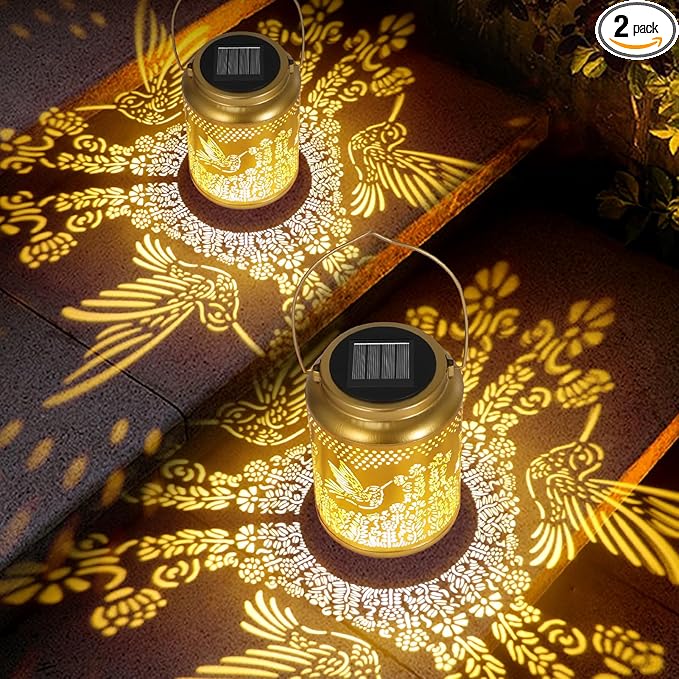 - Graceful Garden Decorations: Solar lantern light can project unique and beautiful Hummingbird patterns in a dim environment, bring life and fun to your garden and attract your family or friends. Beautiful Golden yellow metal veneer and retro hollow out design give it an artistic touch
