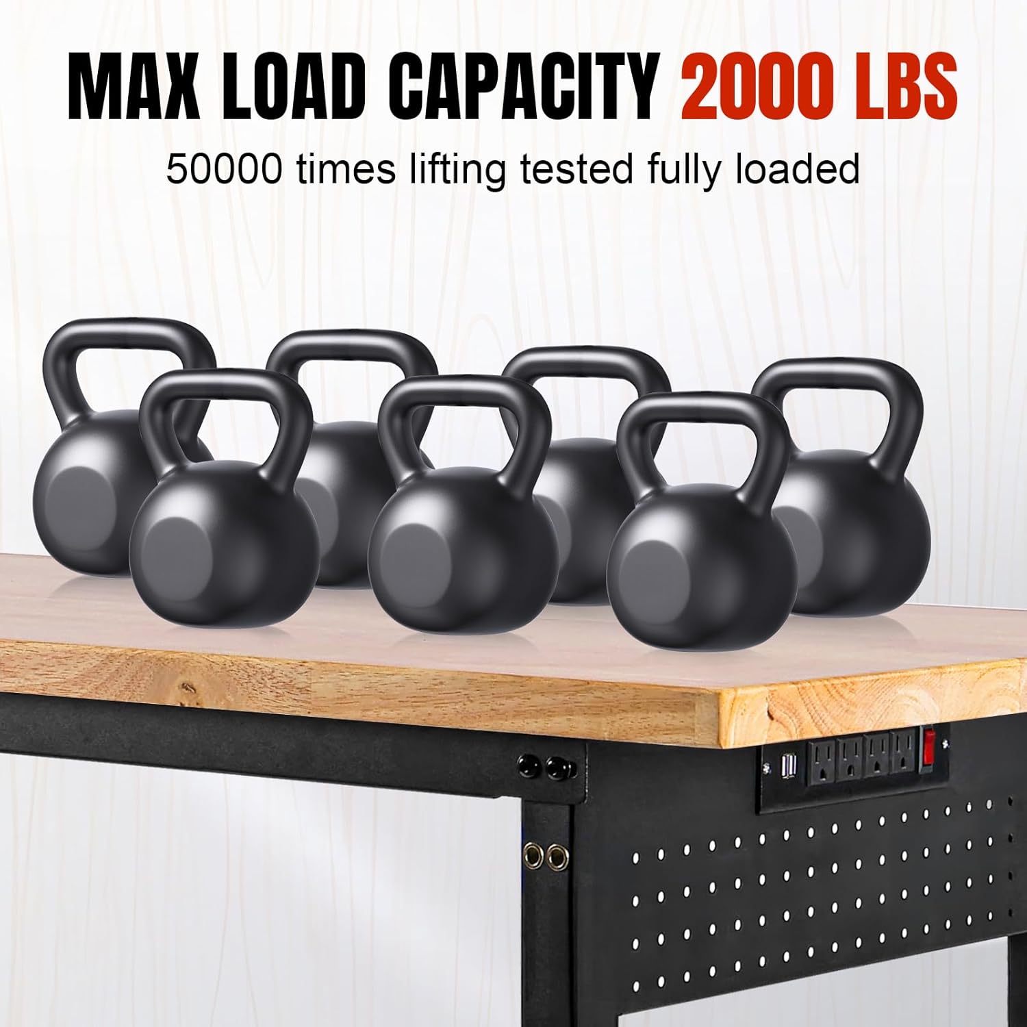 Height Adjustable Workbench with Wheels 60”×22” Heavy Duty Work Table 2000 LBS Capacity Rolling Work Table Rubber Wood Work Station with Power Outlet & Pegboard for Garage, Office, Workshop