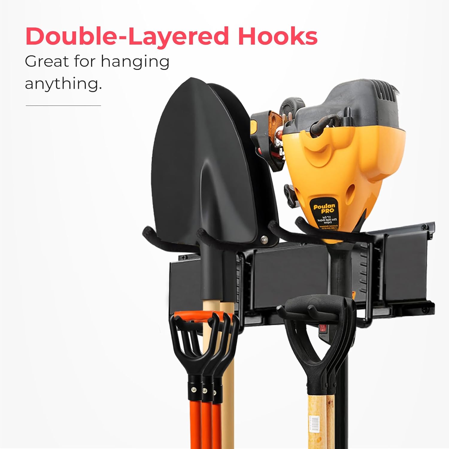 - Dual-function Design - With interchangeable hook and shelf configurations in a modular layout—customize your setup for everything from garden tools to power drills, storage bins and boxes.