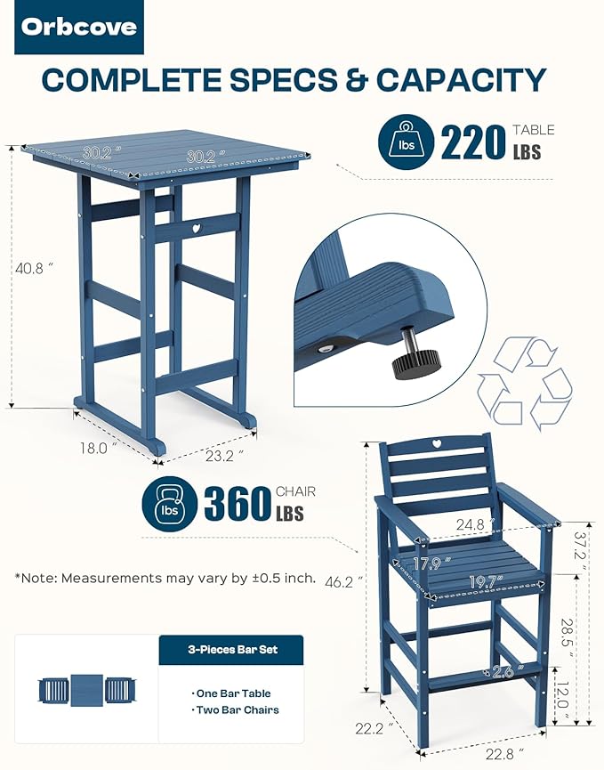 - Durable All-Weather Design: (Please note!!!Your order consists of two separate packages, which may be delivered at different times.) Crafted from HDPE with a natural wood grain finish, Orbcove patio table and chairs set withstands sun, rain, and wind without fading or cracking. Ideal for deck furniture, backyard furniture, or porch furniture, it’s perfect for year-round outdoor living.