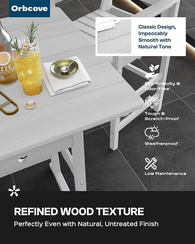 - Durable All-Weather Design: (Please note!!!Your order consists of two separate packages, which may be delivered at different times.) Crafted from HDPE with a natural wood grain finish, Orbcove bar table and chairs set withstands sun, rain, and wind without fading or cracking. Ideal for deck furniture, backyard furniture, or porch furniture, it’s perfect for year-round outdoor living.