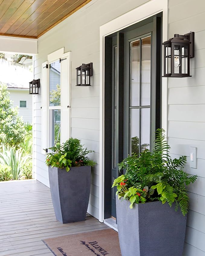 - Modern Elegance, Vintage Soul: What if your outdoor porch light offered more than basic functionality? Our outdoor lights for house merge a refined bronze patina with simple lines—their minimalist profile effortlessly harmonizes with your garage, porch, garden, front door, and various other outdoor environments. The glass shade emits a welcoming warmth, transforming entryways into curated evening spaces and making the patio bathed in its gentle illumination.