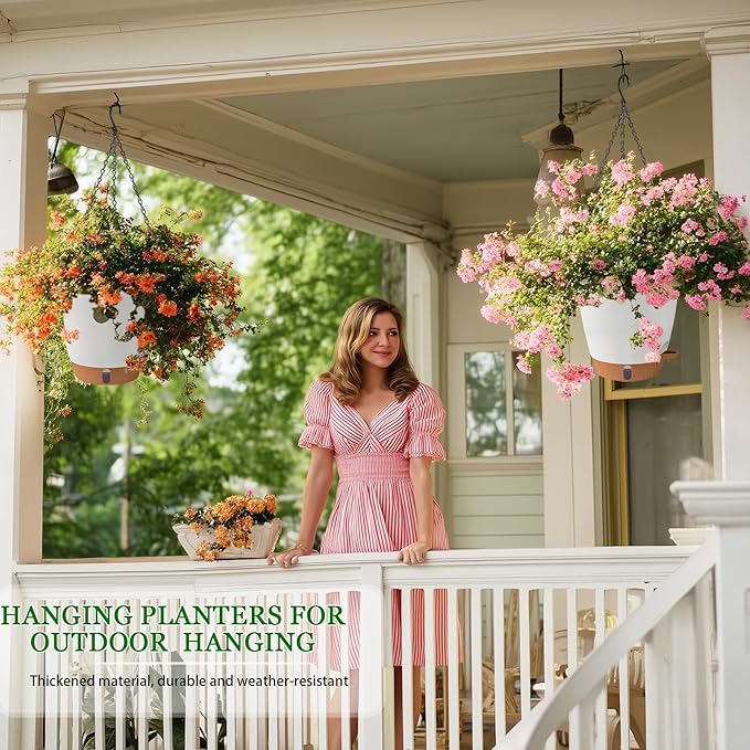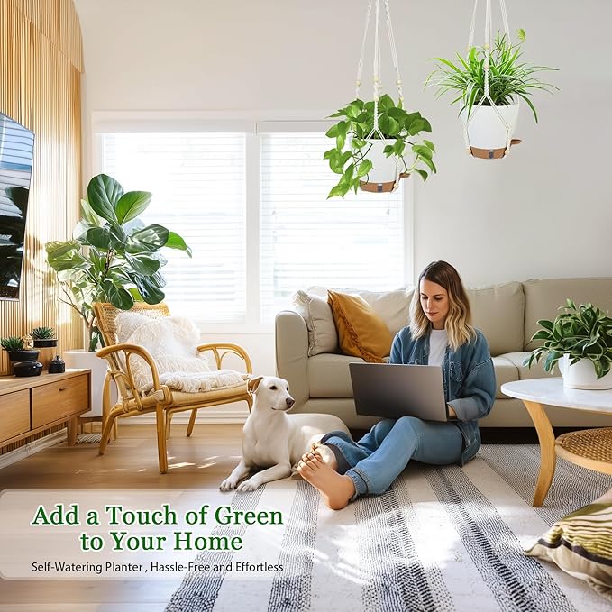 - 【Smart Self-Watering System】 Our hanging plant pots come with a REMOVABLE RESERVOIR TRAY that stores 7-10 day water supply. Absorbent cotton ropes automatically deliver moisture to soil when needed - ideal for vacations or busy lifestyles. Spend less time watering hanging baskets for indoor plants!