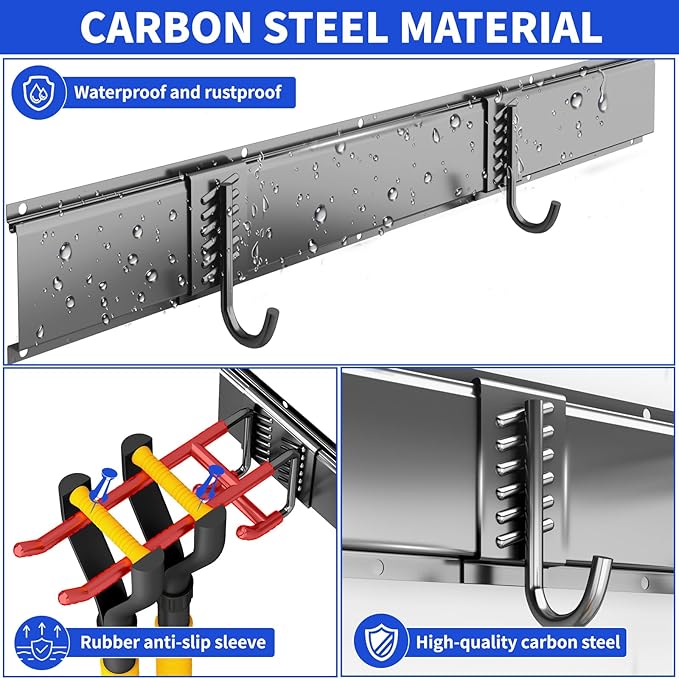 - ADJUSTABLE & VERSATILE STORAGE: tool organizers and storage features 2 tracks and 6 adjustable hooks, a versatile garage organizer for your garage. Customize height and hook placement for various items, from garden tools to folding chairs