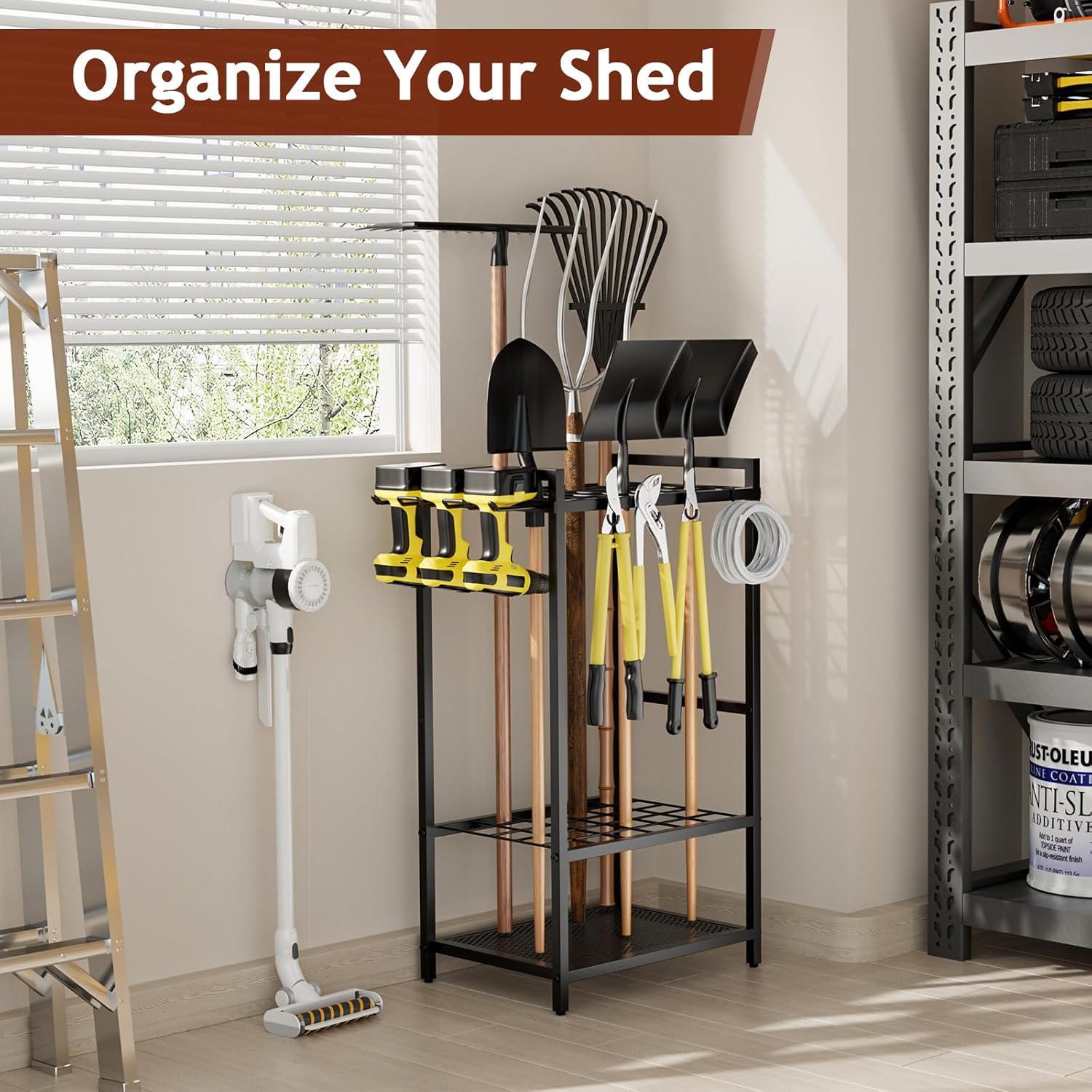 - 【Widely used and holds all tools】: This garden tool storage can be easily moved and placed wherever tools are needed, such as garages, gardens, sheds, and backyards. Custom-built to store gardening, yard, cleaning, and lawn tools, it easily accommodates items like shovels, pitchforks, rakes, dethatchers, pickaxes, mauls, brooms, and more, ensuring everything is in one place and readily accessible. It simplifies tool storage and organization, enhancing space utilization and work efficiency.