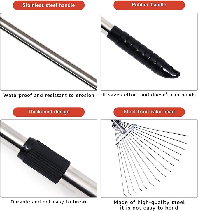 - High-Quality Structure The high-quality stainless steel handle and hardened steel are water-resistant and not prone to rust. They are more durable than ordinary metal rakes in bad weather.