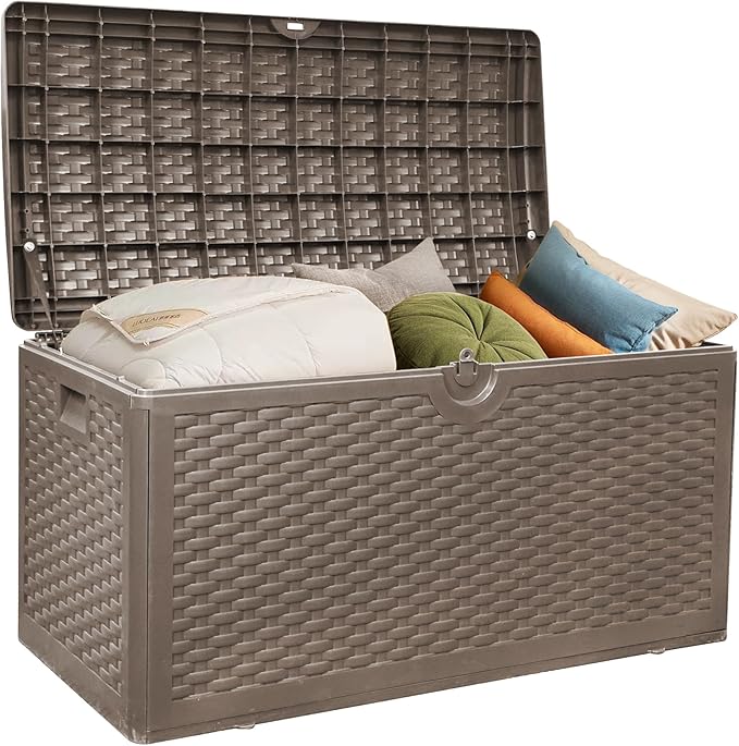 - Our deck box offers an impressive storage capacity, perfect for organizing patio cushions, pool accessories, gardening tools and more. This multipurpose storage solution not only helps keep your outdoor space tidy but also functions as a bench or table. Whether in your backyard or on the patio, this deck box is designed to meet your every need.