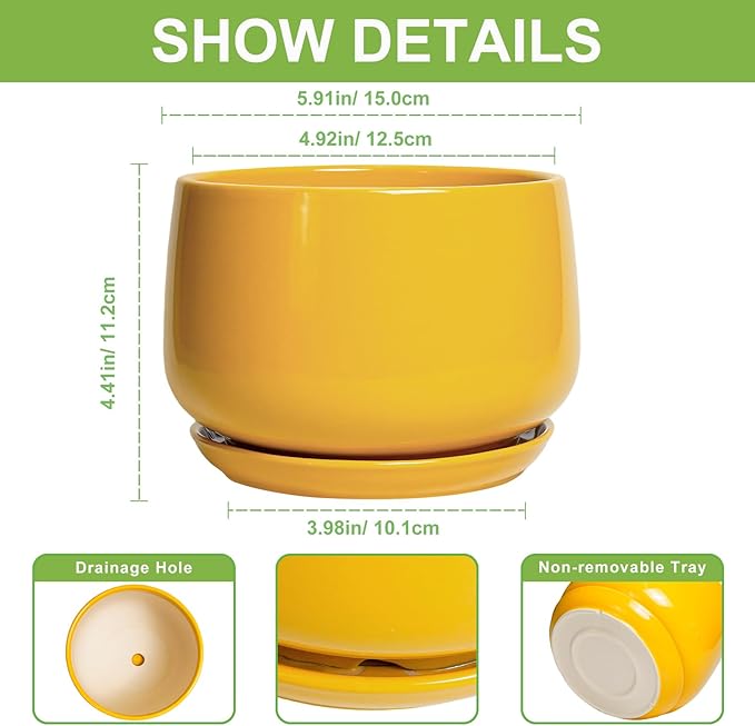 - Dimensions: This ceramic plant pot measures 5.91" x 5.91" x 4.41". This yellow flower pot is an ideal choice for growing succulent plants, cacti, aloe vera, orchids, snake plant, african violet and other indoor & outdoor plants