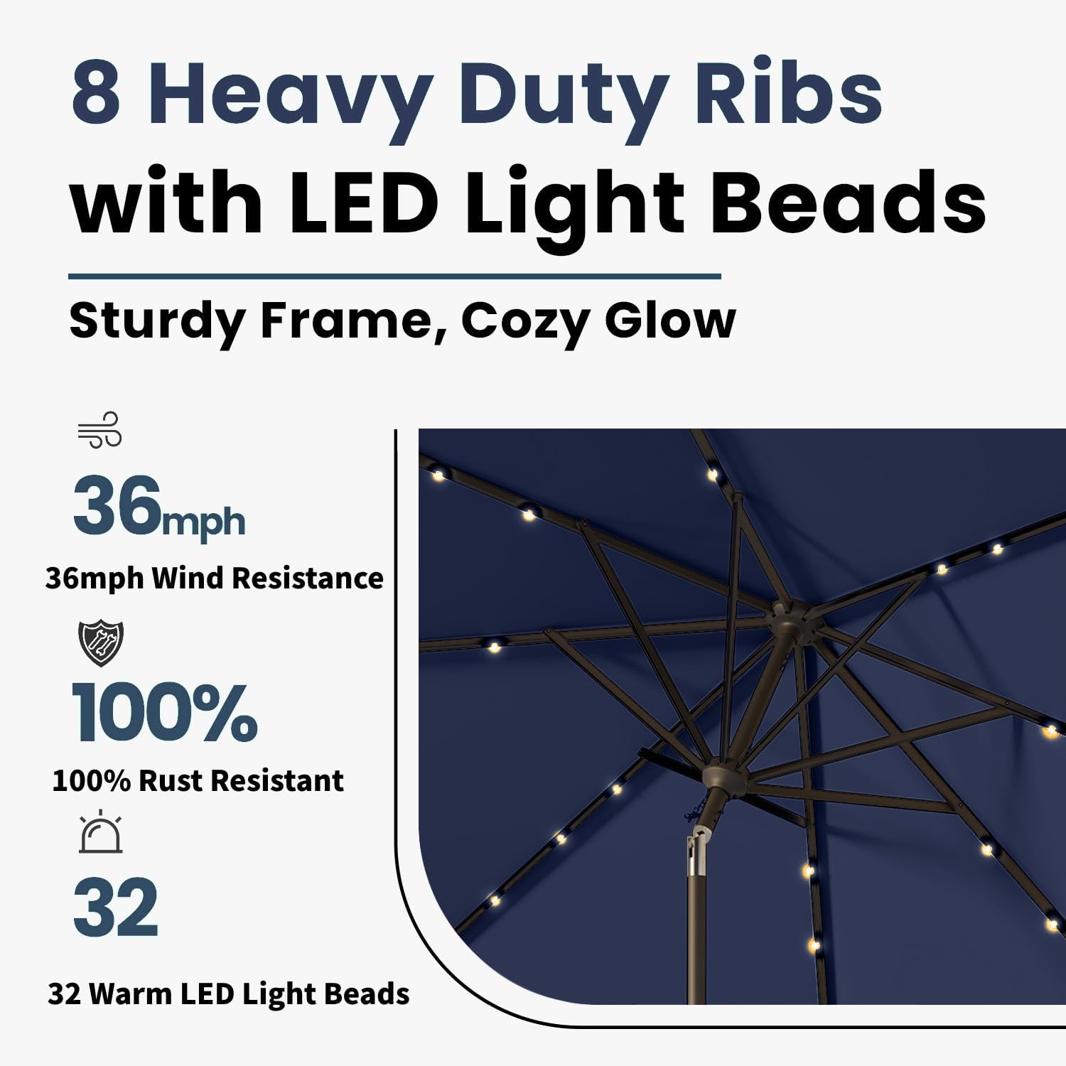 10FT Solar Umbrella 32 LED Lighted Patio Umbrella Table Market Umbrella w/Tilt and Crank, UV-Resistant Outdoor Umbrella for Pool, Garden, Deck, Navy Blue