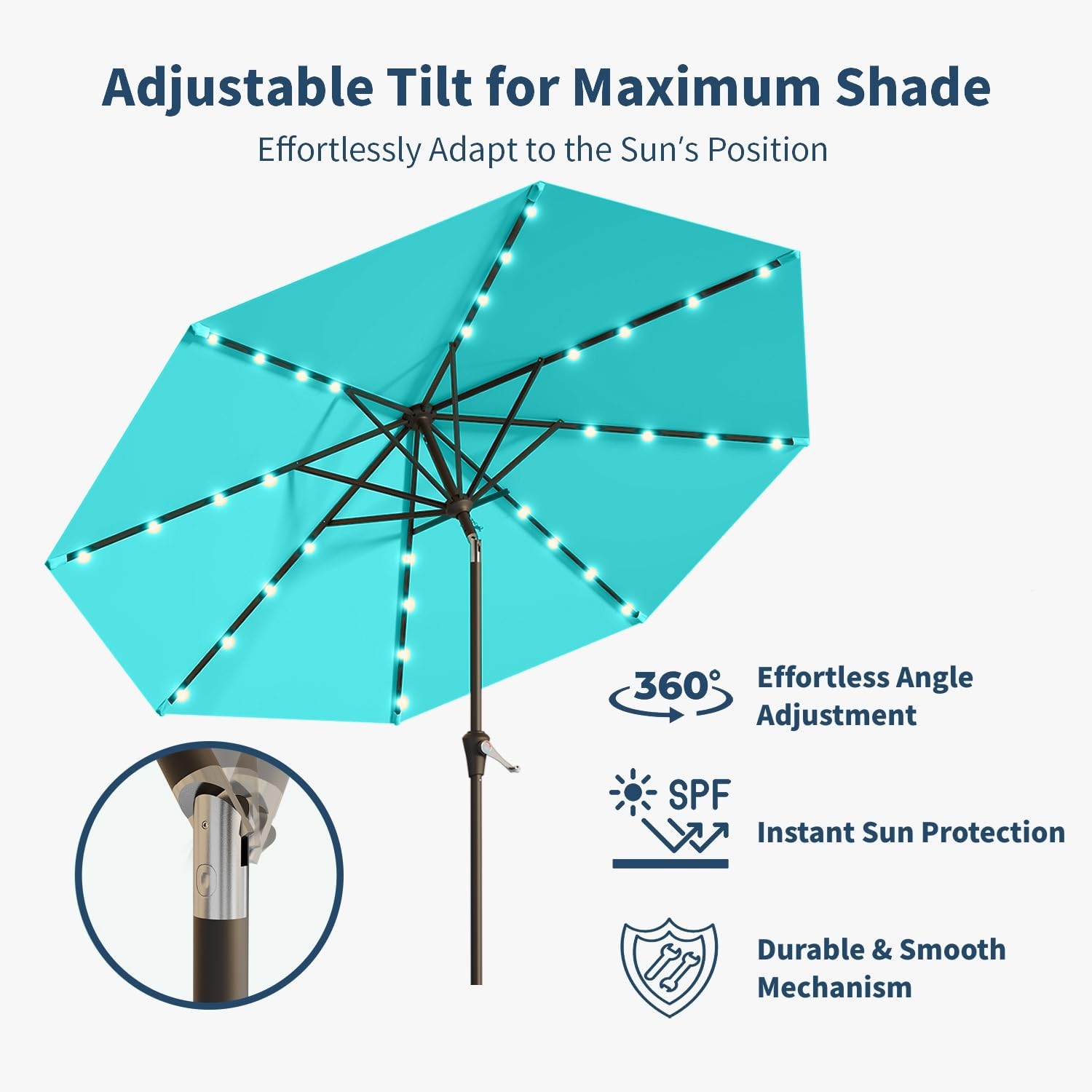 - Convenient Tilt and Crank Mechanism: Easily adjust the umbrella's angle with the push-button tilt feature to block the sun at different times of the day. The user-friendly crank handle allows for smooth opening and closing.