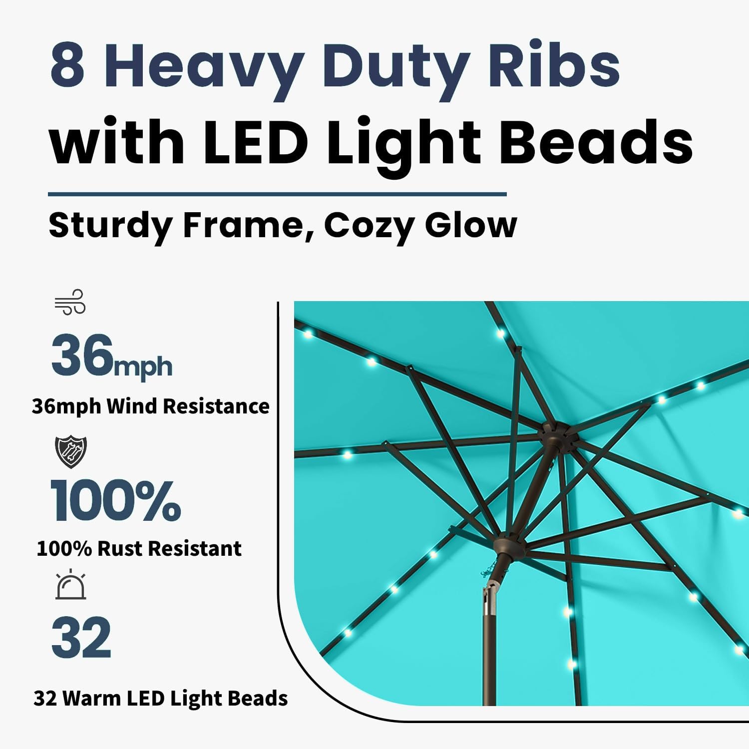 - 32 Solar-Powered LED Lights: Illuminate your evenings with 32 built-in LED lights powered by a high-efficiency solar panel, without the need for external power sources, providing up to 8 hours of ambient lighting.