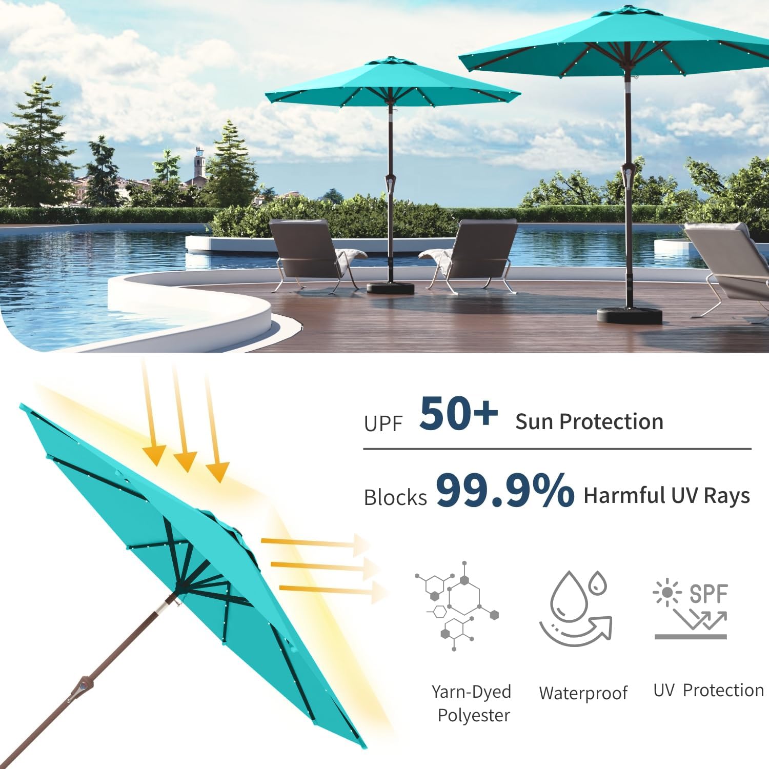 - Durable and Weather-Resistant Canopy: Crafted from 100% polyester fabric, this umbrella is waterproof, UV-resistant, and fade-resistant, ensuring long-lasting color and protection from the sun's harmful rays.